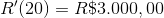Uma empresa produz peças de madeira com tamanho fixo. A quantidade Q de cada peça de madeira, dada em metros, vendida é função do preço P em real por metro. Desta forma, podemos afirmar que a receita das vendas conseguida com o preço de venda P é igual a R(P) = P.f(P). Sabendo-se ainda que f(20) = 10:000,00 e f'(20) = -350,00, calcule o valor de R'(20).