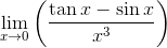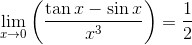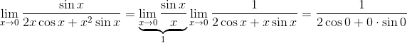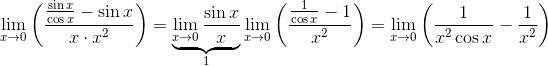 Como o limite está na forma 0/0 podemos aplicar o método de L'Hôpital, ou seja, derivar separadamente cada componente da fração do limite. Será preciso ainda aplicar o limite fundamental do seno para simplificar a expressão.